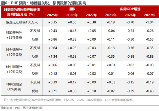 关税:根据PIIE预测(图6),对加墨加征25%关税对美国经济影响较大,反制情况下,将推升2025年通胀0.86个百分点,打击GDP约0.1个百分点,但该关税一再推迟;对中国已经加征20%关税,对美国经济影响相对有限;对全球的“对等关税”计划4月20日宣布,预计以汽车和农产品等部分商品为主。